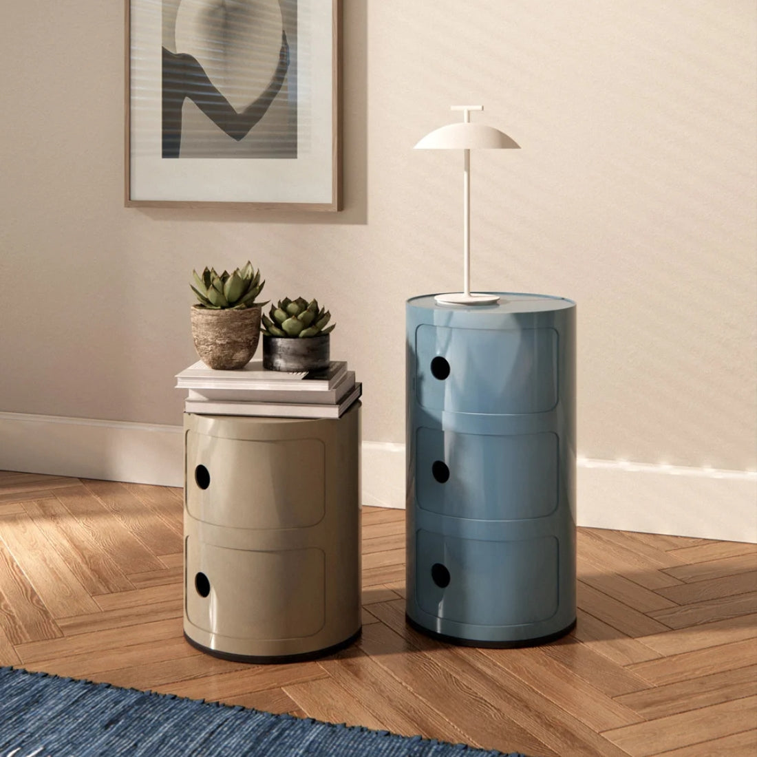 Los elementos modulares se han diseñado para satisfacer distintas exigencias de uso y ser utilizados en cualquier ambiente de la casa. Los Componibili creados en 1967 son un clásico atemporal de la decoración que hoy se presentan con formas redondeadas y 32 cm de diámetro. Gracias a las composiciones fijas de dos, tres y cuatro elementos, resultan prácticos y funcionales en cualquier ambiente. Este modo se ofrece en cinco colores nuevos.