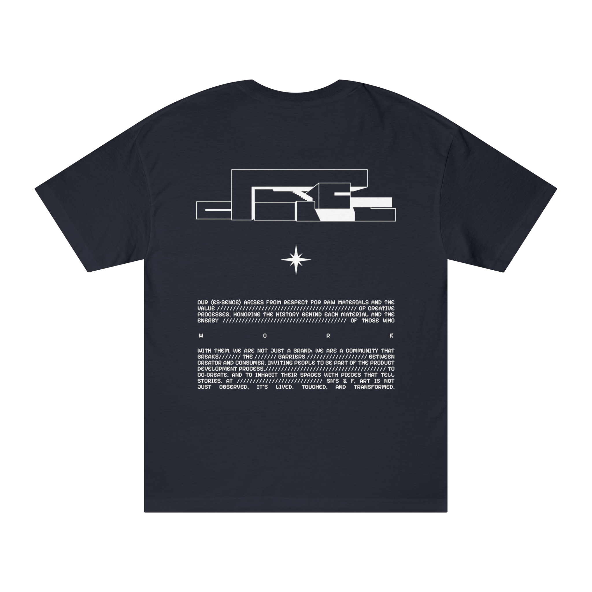 And below, our manifesto: the reminder that Sn’s & F doesn’t just design objects, but collective processes. This tee is for those who understand their space, their clothing, and their art must reflect who they are not what the world expects.